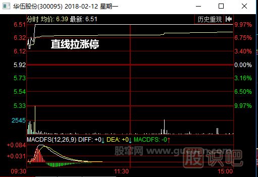 如圖所示,2018年2月12日,華伍股份(300095)經過開盤階段小幅回落后,大量買盤涌出,將行情強勢拉升至漲停板。這樣的形態(tài)說明市場上的買方力量十分強勢,在這個過程中,大量投資者買入股票,股價突破了上方的阻力位,該股的成交量也大幅放大。