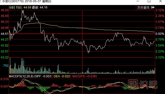 4) 黃色柱線:在紅白曲線圖下方,用來表示每一分鐘的成交量,單位是手(每手等于100股)。