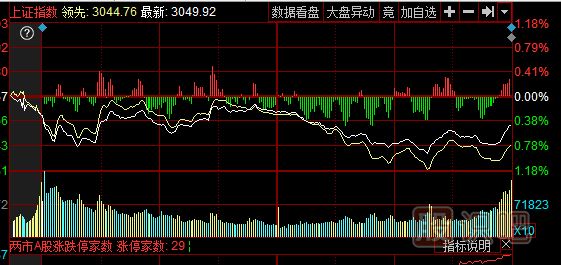 3) 紅綠柱線:在紅白兩條曲線附近有紅綠柱狀線,是反映大盤即時(shí)所有股票的買盤與賣盤在數(shù)量上的比率。紅柱線的增長減短表示上漲買盤力量的增減;綠柱線的增長縮短表示下跌賣盤力度的強(qiáng)弱。