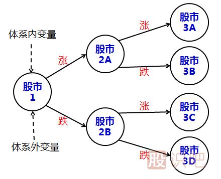 假設(shè)某股票市場只有漲跌兩種狀態(tài),無漲跌幅大小之區(qū)分,并假定其初始狀態(tài)是【股市1】,那么股價下一步的運動方向就應(yīng)該是所有【體系內(nèi)變量】和【體系外變量】的函數(shù)。但是我們上面已經(jīng)闡述過了,由于體系內(nèi)變量的超高維性,以及體系外變量的事先不可預(yù)知性,所以掌握所有體系內(nèi)外變量是不可能的,因此也不可能精確預(yù)測到股價的下一步走勢。