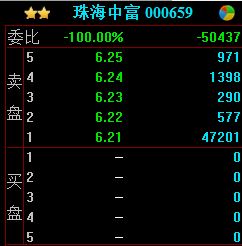 (2)跌停板委比為-100%,委托盤(pán)全是賣(mài)盤(pán)。以2017年1月12日跌停的珠海中富為例:買(mǎi)盤(pán)沒(méi)有委買(mǎi)量,而賣(mài)盤(pán)有委賣(mài)量。賣(mài)一的數(shù)量比較高,這樣的股票,明天低開(kāi)的可能性非常大,甚至是直接一字跌停。
