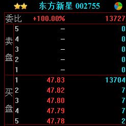 (1)漲停板委比值為100%,委托盤(pán)全是買(mǎi)盤(pán)。以2017年1月12日漲停的東方新星為例,可看出賣(mài)盤(pán)沒(méi)有委賣(mài)量,而買(mǎi)一的委買(mǎi)數(shù)量遠(yuǎn)遠(yuǎn)高于買(mǎi)二,說(shuō)明該股受市場(chǎng)資金的青睞,比較強(qiáng)勢(shì),明天高開(kāi)的可能性就比較大。