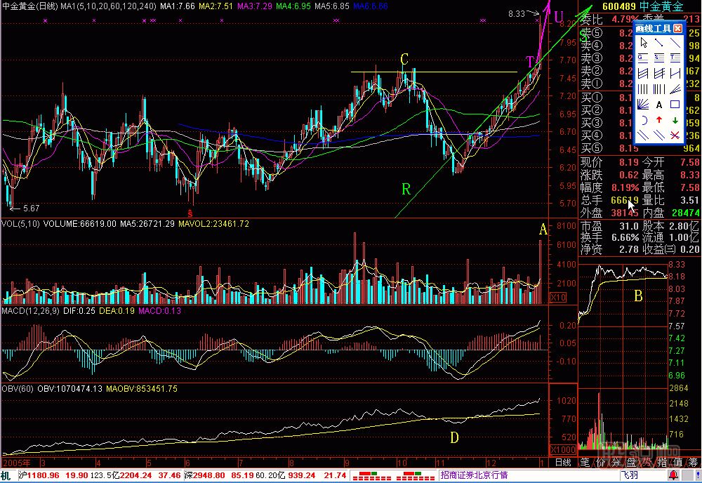 收盤后,見(圖223-3)所示,放量打拐的圖形就直觀得多,A點(diǎn)的成交量柱體圖比5日均量線高出2倍有余,明顯放量。日k線原來的上升速度是R至S的斜率,現(xiàn)在拐成T至U的斜率,顯然是加速度上升。您如果在上午10:09的時(shí)候買入,正好打擊在拐點(diǎn)上,故稱為放量打拐。
