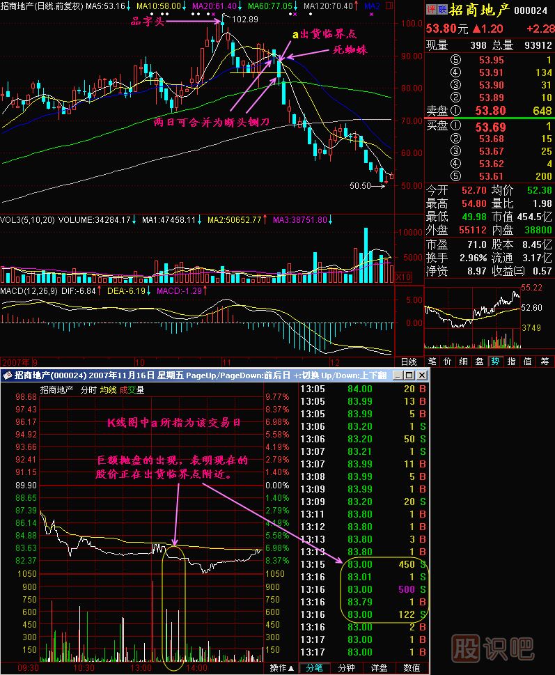 小結(jié):莊家在頭部區(qū)間出貨有一個(gè)臨界點(diǎn),這個(gè)臨界點(diǎn)之前股價(jià)是緩慢滑跌,屬于潛派發(fā),而這個(gè)臨界點(diǎn)之后股價(jià)往往快速下跌,屬于強(qiáng)派發(fā),此時(shí)股價(jià)往往出現(xiàn)了三死叉見(jiàn)頂、價(jià)壓、斷頭鍘刀、空方炮等等圖形,這個(gè)時(shí)候最容易出現(xiàn)巨量拋盤(pán)誘發(fā)大跌勢(shì)的情況,如果在盤(pán)中發(fā)現(xiàn)這樣的情況,可得要抓緊時(shí)間出貨,否則股價(jià)將會(huì)加速下跌,如果不及時(shí)出貨很容易會(huì)被高位套牢!