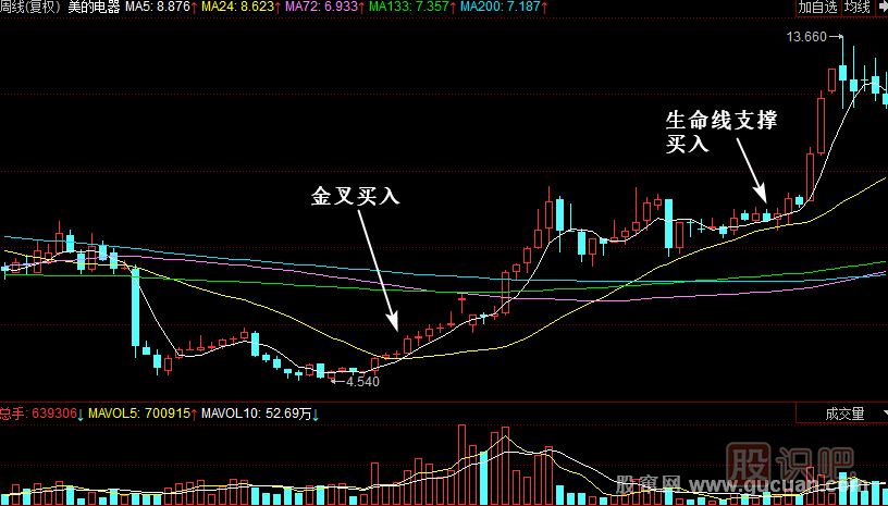 (1)在5日線上穿24日生命線是最好的買入機(jī)會。成交量配合就是最佳切入點(diǎn)。