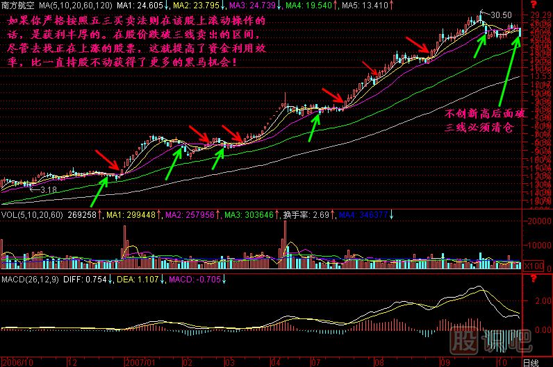 小結:五線之上買入,三線之下賣出;反彈不上五線時,逢高清倉。這就是五三買賣法則的精辟總結。
