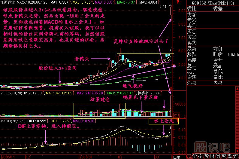 我們還練習(xí)過水下死叉沉船快一節(jié),那一節(jié)正好和本節(jié)是對立的,本節(jié)是在水上(零軸線上)金叉,而那一節(jié)是在水下(零軸線下)死叉,它們所得到的效果正好的反的,水下死叉沉船快預(yù)示股價(jià)有一段加速下跌,而水上金叉則預(yù)示股價(jià)有一段快速上揚(yáng)。