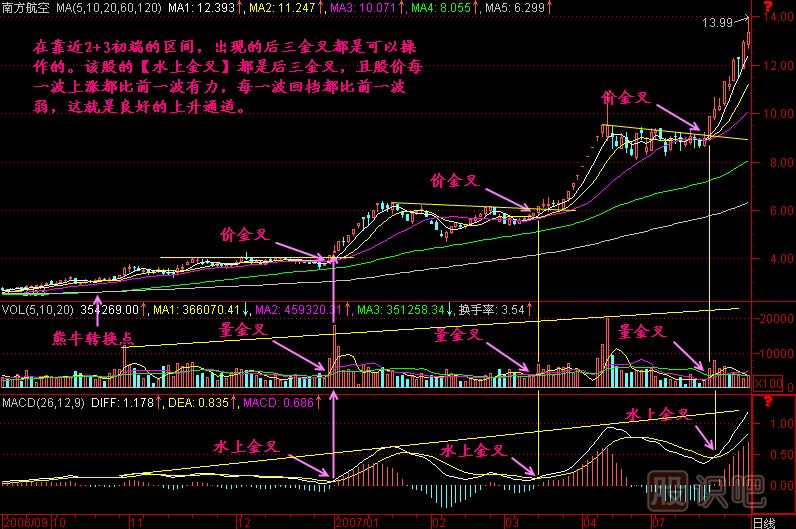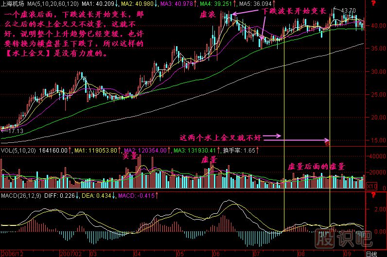 一只股票要維持良好的上升通道,應(yīng)該是一波比一波漲勢有力,一波回檔比一波回檔淺,直到最后沒有回檔的飆升出現(xiàn),那就接近頭部了。而一波比一波漲幅沒力,回檔卻開始變深的時(shí)候,就要小心了。在這之后出現(xiàn)的所謂水上金叉已經(jīng)沒有爆發(fā)力了,所以這樣的金叉不是我們能操作的金叉了。