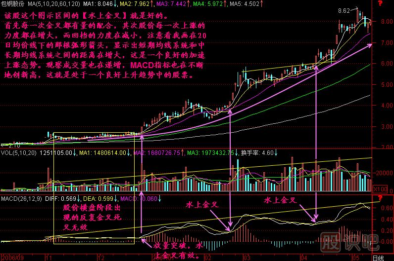 什么樣的水上金叉才是可以操作的?或者說什么樣的水上金叉漲幅會(huì)大些?會(huì)安全些?請看下圖。