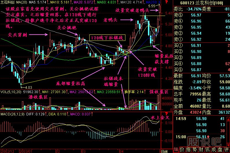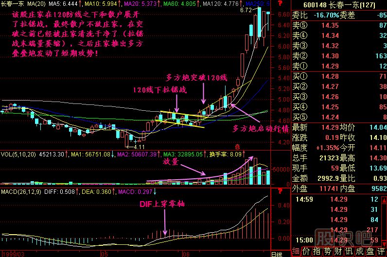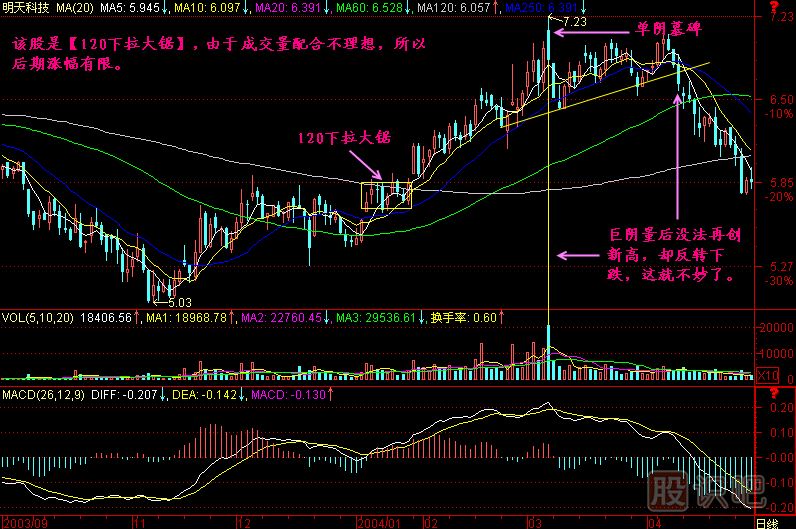 小結(jié):120線下拉鋸戰(zhàn)是散戶消耗戰(zhàn),散戶最終都將在拉鋸戰(zhàn)中戰(zhàn)敗而乖乖交出籌碼,在拉鋸戰(zhàn)末端一般都有量萎縮,說明已經(jīng)達到莊家洗盤的目的,那么只要后期一根放量陽線突破拉鋸戰(zhàn)壓力線和120防線,行情就啟動了,起碼要漲一段路。