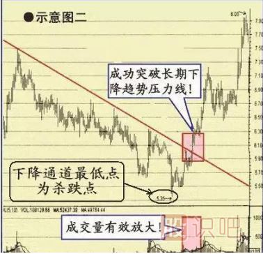個股經(jīng)過長時間的大幅下跌,在成交量放大的配合下,成功突破下降趨勢線的束縛,很快進(jìn)入上漲走勢,給了投資者一個很好的買入機(jī)會。