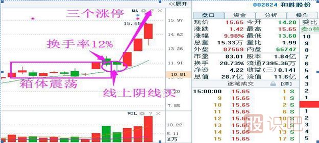 再來看上圖的和勝股份,就是通過箱體突破戰(zhàn)法選出來的,在3月19日換手率達(dá)到12%以上,股價(jià)突破箱體,,量能也是上漲放量,下跌縮量,資金持續(xù)的在流入,果斷的選出來,之后連續(xù)的三上漲停。