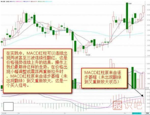 在實(shí)踐中,MACD紅柱可以連續(xù)出現(xiàn)兩波甚至三波連續(xù)性翻紅,這是價格強(qiáng)勢連續(xù)上升的結(jié)果。操作上我們最期待這樣的走勢。在價格出現(xiàn)小幅調(diào)整或震蕩再重新拉升時,MACD紅柱原來由逐步萎縮(未出現(xiàn)翻綠)到又重新放大,這是一個買入信號。