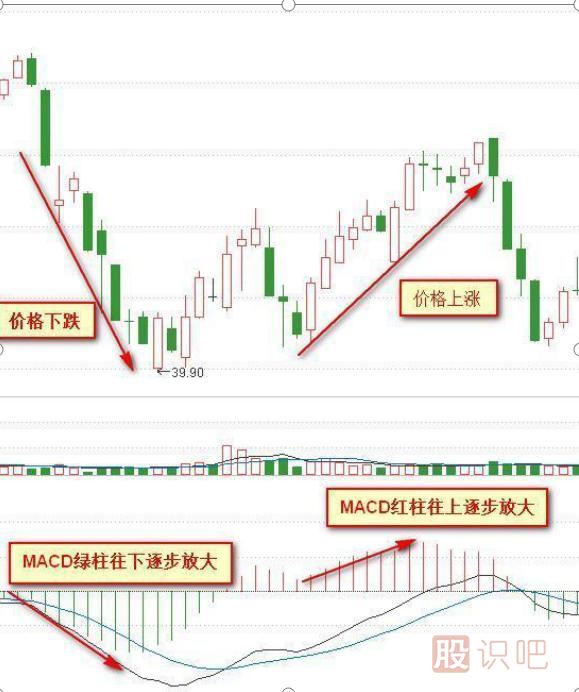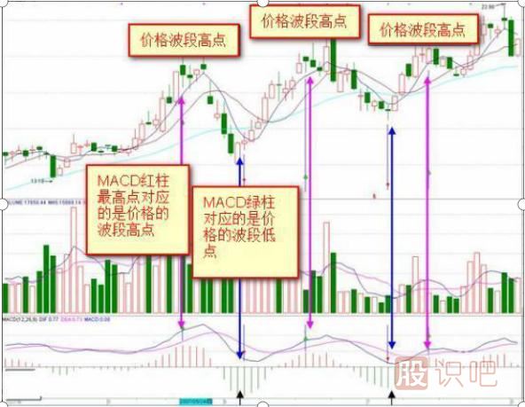 價格下跌,MACD綠柱逐步放大,當(dāng)綠柱出現(xiàn)最高點(diǎn)時(最長綠柱),價格也往往對應(yīng)出現(xiàn)波段低點(diǎn);(背離時不會對應(yīng))