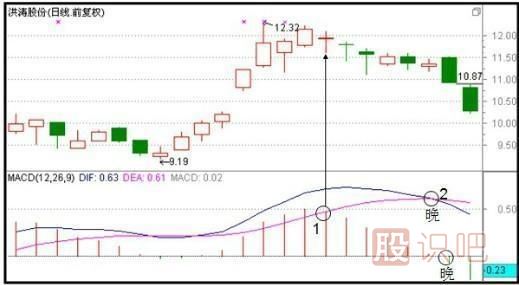 標(biāo)注點(diǎn)2:紅柱不斷縮短,同時DIF與DEA形成了死叉,所對應(yīng)的股價為陽十字星;如果你按照死叉賣出的原則 明顯滯后(相對點(diǎn)1);紅柱不斷縮短由紅變綠(相對點(diǎn)1更加晚了)也是滯后。