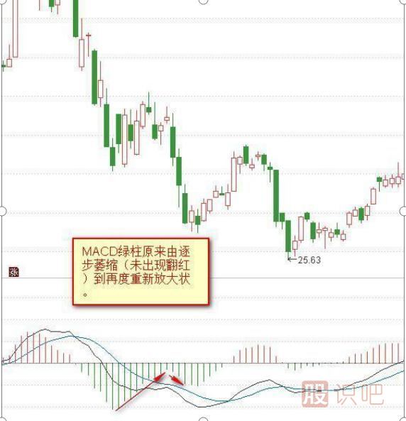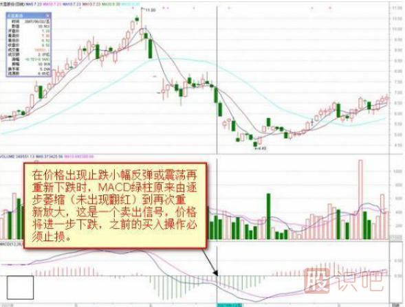 在實(shí)踐中,MACD綠柱可以連續(xù)出現(xiàn)兩波甚至三波連續(xù)性翻綠,這是價格弱勢連續(xù)下跌的結(jié)果。操作上我們必須小心這樣的走勢。在價格出現(xiàn)止跌小幅反彈或震蕩再重新下跌時,MACD綠柱原來由逐步萎縮(未出現(xiàn)翻紅)到又重新放大,這是一個賣出信號。價格將進(jìn)一步下跌,之前的買入操作必須止損。