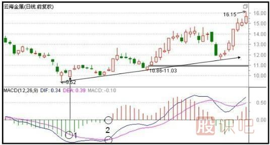 標(biāo)注點(diǎn)2:DIF上穿DEA形成了金叉,能量柱由綠翻紅,這個位置可以抄底,但是逃不掉MACD的滯后盲點(diǎn)。