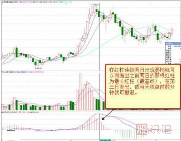 當(dāng)價格上漲,MACD紅柱逐步放大,當(dāng)紅柱出現(xiàn)最高點(diǎn)時賣出。問題是我們該如何判斷當(dāng)日MACD紅柱是不是最長的那一根呢?因?yàn)榧t柱逐步放大過程中紅柱多少根數(shù)量是不固定的,放大了還可以繼續(xù)放大。