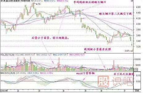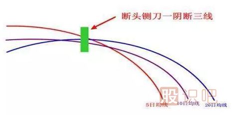 當5日、10日和20日內買進股票的平均成本越來越接近時,人們發(fā)現早買或遲買股票一樣都無可盈利,購買股票的迫切性降低。而市場另一方面賣出方已明顯感到購買力降低,愿意用更低的價格出售股票。于是有一天賣出方突然用低于三條均線的價格大量賣出,當日收盤價跌破三條均線,形成“斷頭鍘刀”。5日、10日和20日內買進股票的人突然發(fā)現已被套牢,先知先覺者在第二天行情中愿意用比“斷頭鍘刀”這根陰線收盤價更低的價格沽出,于是發(fā)生空殺空行情。此時股票供應量急驟增加,而股票需求量急驟減少,終于誘發(fā)一輪跌勢。