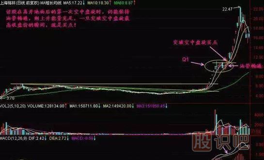 1、該股在離開地面后的第一次空中盤旋時,仍能保持油管暢通,則上升能量充足,一旦突破空中盤旋最高收盤價的瞬間,就是買點。