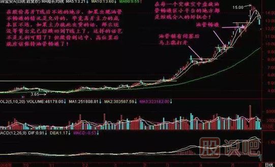3、在股價高開T線后不遠的地方,如果出現(xiàn)油管不暢通的情況是允許的。畢竟高阿奎主力的成本區(qū)不遠,如果主力就此出貨的話,那么還沒等貨出完已經(jīng)跌回去T線上了,這樣的話豈不是無利可圖了。但是股價到達中,高尾椎以后就應(yīng)該保持油管暢通。