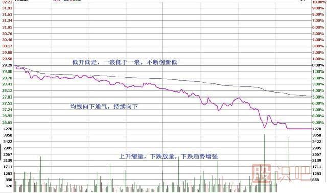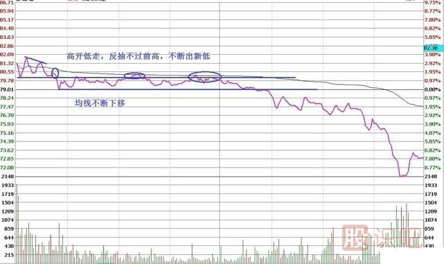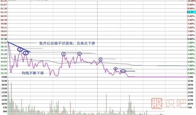 低開后反抽不過前高且高點(diǎn)下移,均線跟下