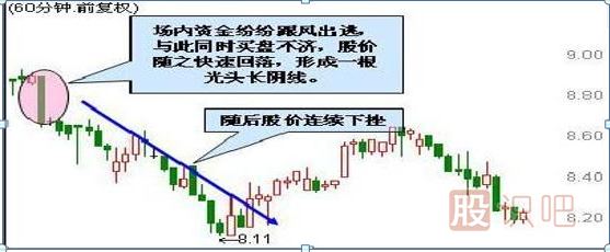 股價連續(xù)上漲后,運(yùn)行至高位,突然在某個60分鐘內(nèi)大拋單連續(xù)涌出,導(dǎo)致場內(nèi)資金紛紛跟風(fēng)出逃,與此同時買盤不濟(jì),股價隨之快速回落,形成一根光頭的長陰線。此K線形成后,通常表示主力出逃堅決,短期內(nèi)不再會給高位套牢盤出逃機(jī)會,個股后期走勢看淡。