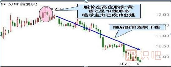 個股加速上漲運(yùn)行至高位,突然在某個60分鐘內(nèi)加速上攻形成一根長陽線;隨后在下一個60分鐘內(nèi)多空力量達(dá)到短暫平衡,形成高位十字星;接著大量獲利盤兌現(xiàn),導(dǎo)致股價快速下跌,形成一根陰線。這三根K線組合形態(tài)稱之為“黃昏十字星”,通常預(yù)示著股價即將下跌。