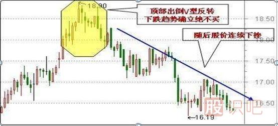 股價在上漲趨勢中,由于市場看好的氣氛使得買盤強(qiáng)勁增多,股價上漲的速度越來越快,多頭得到極度宣泄之后,便出現(xiàn)了危機(jī),短線客見股價上漲乏力便會反手做空,這種現(xiàn)象越演越烈,股價觸頂后便一路下跌,這樣就產(chǎn)生了倒V形走勢。此K線形成后,多方短期內(nèi)難以再組織有效反攻,通常股價近一步下跌。
