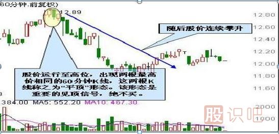 股價運(yùn)行至高位,上攻受阻,拋壓逐漸加重。隨后連續(xù)兩個60分鐘K線有相同或極為相近的最高價,這兩根K線稱之為“平頂”形態(tài)。該K線形態(tài)形成后,意味著短期上攻受阻,行情摸高見頂,股價即將反轉(zhuǎn)。不過平頂形態(tài)的反轉(zhuǎn)力度較小,通常以陰跌為主。