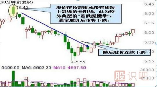 看跌捉腰帶形態(tài)是一根長陰線,它的開市價位于單位K線的最高點(diǎn)(或者這根蠟燭線只有極短的上影線),然后市場一路下跌。在市場處于高價區(qū)的條件下,看跌捉腰帶形態(tài)的出現(xiàn),構(gòu)成了頂部反轉(zhuǎn)信號。捉腰帶實體線的長度愈長,則該形態(tài)的技術(shù)意義越重大。
