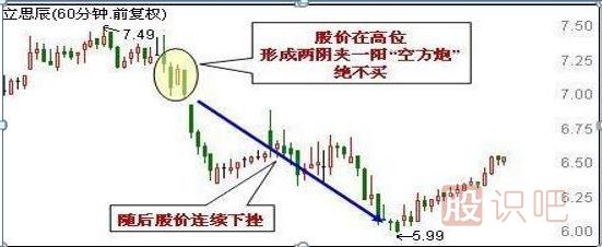 所謂的空方炮就是指兩陰夾一陽的K線形態(tài),它由兩根較長的陰線和一根較短的陽線組成,三根K線呈下跌趨勢,陽線夾在陰線之中,陰線的頂部盡量低,陽線的實體盡量短。當(dāng)股價在高位區(qū)域出現(xiàn)空方炮時,表示空方取得支配地位,多方雖有反抗,但力量微弱,明顯不敵空方,后市看跌。