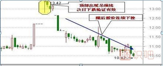 個股運(yùn)行至高位,突然某個60分鐘內(nèi)拋盤不斷涌出,導(dǎo)致股價快速回落,隨后買盤涌入,股價逐步回升至上一個60分鐘K線收盤價附近,形成一根吊頸線。此K線是較為明顯的看空形態(tài),當(dāng)?shù)跏拙€出現(xiàn)的次日向下跳空缺口越大,表示下跌的可能性越大。