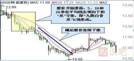 當(dāng)股價形成頭部時,必然是莊家大量出貨的區(qū)間。因此,在60分鐘K線圖上會連續(xù)出現(xiàn)陰線,有時多達(dá)九根陰線,稱為九陰白骨。在日k線圖上出現(xiàn)九根陰線的機(jī)會不多,但多陰白骨爪的圖形還是挺多的。由于股價開始滑落60分鐘K線圖上的5、10和20單位平均線會出現(xiàn)向下的“爪”字形,稱為九陰白骨爪。