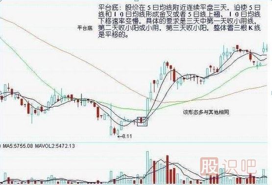 股價(jià)在5曰均線附近連續(xù)平盤(pán)三天,迫使5曰線和10曰均線形成金叉或者5曰線上翹、10曰均線下移速率變慢,具體的要求是三天中第一天收小陰線,第二天收小陽(yáng)或小陰,第三天收小陽(yáng),整體看三根K線是平移的。