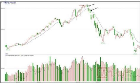 7、在原先成交極度萎縮的情況下,從某天起,成交量出現“量中平”或“量大平”的現象。