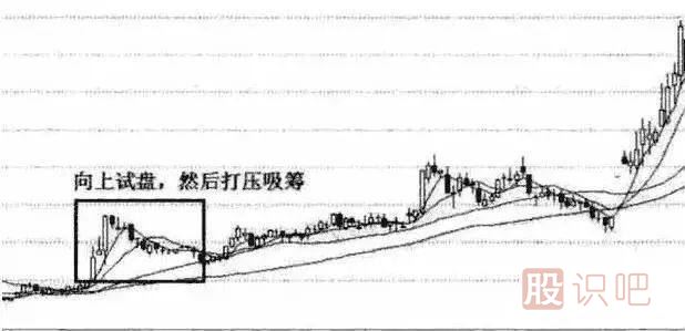 一般而言,莊家為了了解某只股的籌碼鎖定程度,必須在風(fēng)平浪靜的時候,出其不意地,猛然將該股的股價大幅拉升,然后讓其自然回落,以便測試盤中籌碼的拋壓情況。如果拉升時有大量的拋盤涌出,說明在該價位以下莊家可以展開打壓建倉動作,如果拉升時拋盤稀少,說明該股在該價位以下收集籌碼時會有困難,必須考慮以更高的成本價格進行拉高收集,才能完成建倉任務(wù)。具體表現(xiàn)在K線圖表上的話,就是在風(fēng)平浪靜中猛然出現(xiàn)一根長長的上影線,這叫向上試盤,目的是測試盤中拋壓大小,分辨建倉的難易程度。