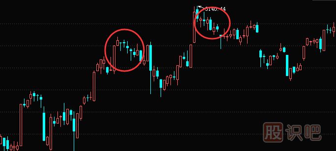 二、在K線形態(tài)上,K線實(shí)體較小,經(jīng)常有多根或連續(xù)性的小陰小陽線,并且其間經(jīng)常出現(xiàn)十字星走勢;