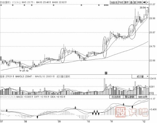 圖7-27是農(nóng)發(fā)種業(yè)(600313)的日k線圖,隨著成交量不斷地放大,股價的波動重心不斷上移。股票短線看盤技巧跟您說個股走勢中最容易賺錢的買入點(diǎn)位在圖中可以看到,股價三次形成的突破有一個明顯的共性,那就是在股價創(chuàng)下了近期新高的時候,突破K線指標(biāo)都隨之發(fā)出了買點(diǎn)提示,指標(biāo)的提示說明此時的短線突破是真實可靠的,量能放大的性質(zhì)是資金在不斷地建倉。