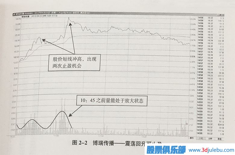 如圖2-2所示,博瑞傳播的分時(shí)圖顯示,股價(jià)在開(kāi)盤(pán)后震蕩上升,并且放量狀態(tài)持續(xù)到1045。從價(jià)格兩波段的上漲情況來(lái)看,投資者容易發(fā)現(xiàn)這兩波段上漲的買(mǎi)點(diǎn)。兩次放量過(guò)程中,股價(jià)都出現(xiàn)了股指期貨短線交易技巧試談T+0靈活的交易方式實(shí)例快速回升的情況。如果投資者把握好最佳賣(mài)點(diǎn),顯然可以獲得不錯(cuò)的回報(bào)。當(dāng)然,兩次價(jià)格回升的時(shí)候,投資者可以采取兩次止盈完成T+0的做空動(dòng)作。