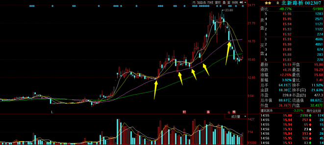 龍頭股跌破五日線維持震蕩,等待十日線上移后,當(dāng)踩到十日線的時候,通常會有反彈,但只有少數(shù)個股走出了反彈行情。