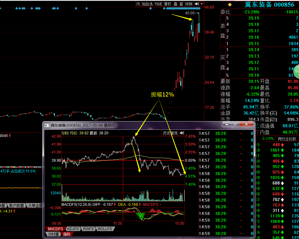 冀東裝備2017/5/24,冀東裝備午后震蕩上升,隨后大幅跳水,全天振幅達(dá)12%,這是資金大幅出逃的跡象,結(jié)合上述三條,龍頭個股短線上升末期,出現(xiàn)這樣的形態(tài),大概率見頂了。