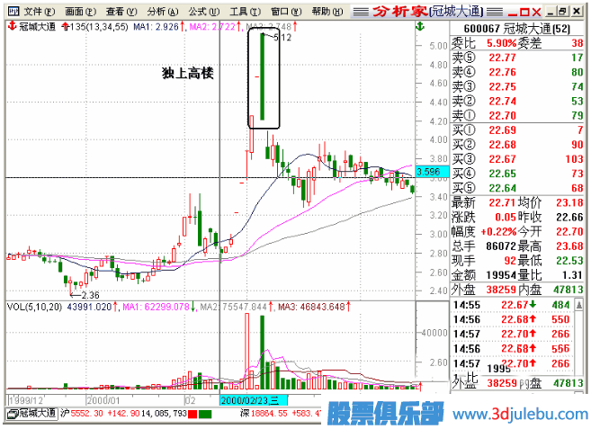 股價經(jīng)過大幅揚升后,突然在某一天,股價跳空高開,以漲停板開盤居多,然后逐波回落,主動性拋盤明顯增多,表明主力去意已決,盤中若漲時縮量,跌時增量,更是見頂信號,許多個股出現(xiàn)高位巨量陰線,十之八九會開形成大頭部,我們把這根高位巨量陰線稱之為“獨上高樓”。