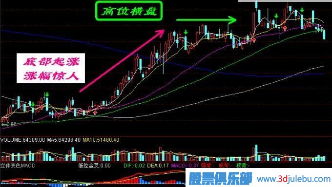 1.從某只個(gè)股的日K線圖表上看,自底部算起,這類個(gè)股的累計(jì)漲幅一般已經(jīng)相當(dāng)大,通常已經(jīng)具有80%左右的獲利幅度。