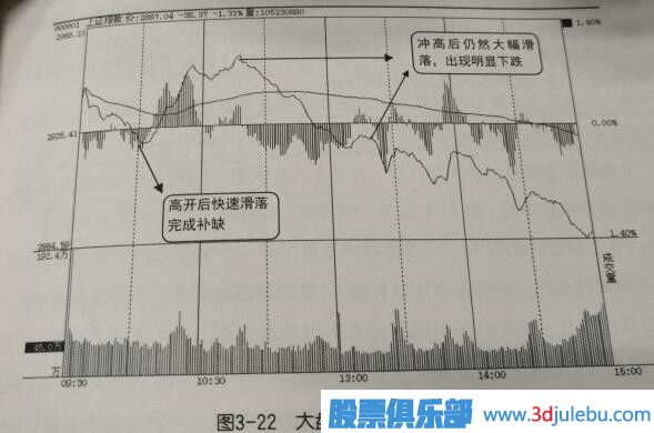 如圖3-22所示,大盤高開回落回補(bǔ)缺口,盡管補(bǔ)缺后出現(xiàn)-波拉升,但最終仍然下跌。