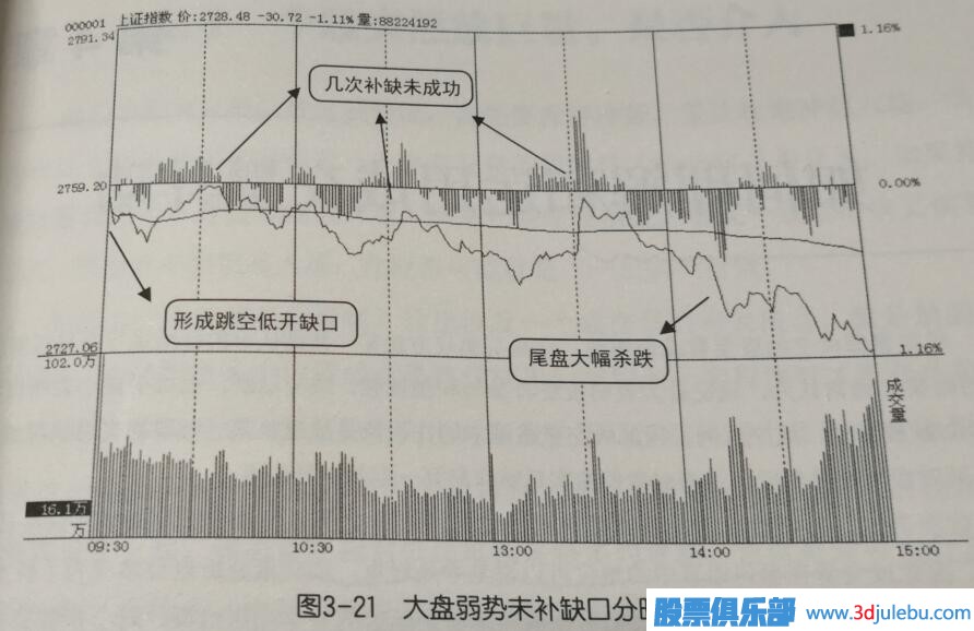 如圖3-21所示是大盤某天的分時(shí)走勢圖,圖中顯示當(dāng)天大盤低開后盤中有多次回補(bǔ)跳空缺口動(dòng)作, 但最終都