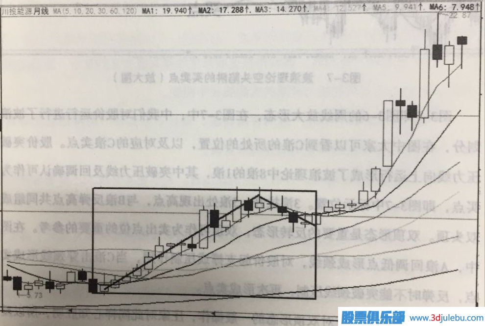 圖3-6是川技221年1月至1月的月線走勢。月線級別的K線走勢清晰明了,大家都能清楚地看到股價所在的位置,在圖中我們也把月線級別的1浪和2浪做了標示。為了使大家更清楚地看到莊家利用波浪理論布置的空頭陷阱,我們對1浪和2浪做了放大處理。