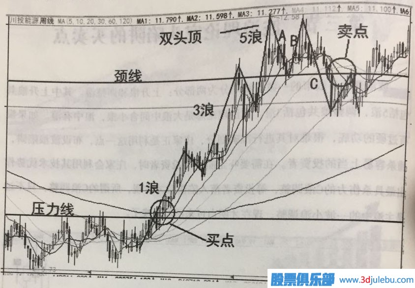 圖3- 7即圖3 -6的周線放大形態(tài),在圖3-7中,中我們對股價運行進行了波浪劃分,在圖中大家可以看到C浪的所處的位置,以及對應的C浪賣點。股價突破壓力線向上運行形成了波浪理論中8浪的1浪,其中突破壓力線及回調(diào)確認可作為買點,即圖3-7中標示位置。3浪拉升,5浪處出現(xiàn)高點,與B浪反彈高點共同組成雙頭頂。雙頂形態(tài)是重要的反轉(zhuǎn)形態(tài),雙頂可作為賣出點位的重要的參考。在圖中,A浪回調(diào)低點形成頸線,對股價起支撐或壓制作用,當C浪擊穿頸線形成賣點,反彈時不能突破頸線壓制,再次形成賣點。