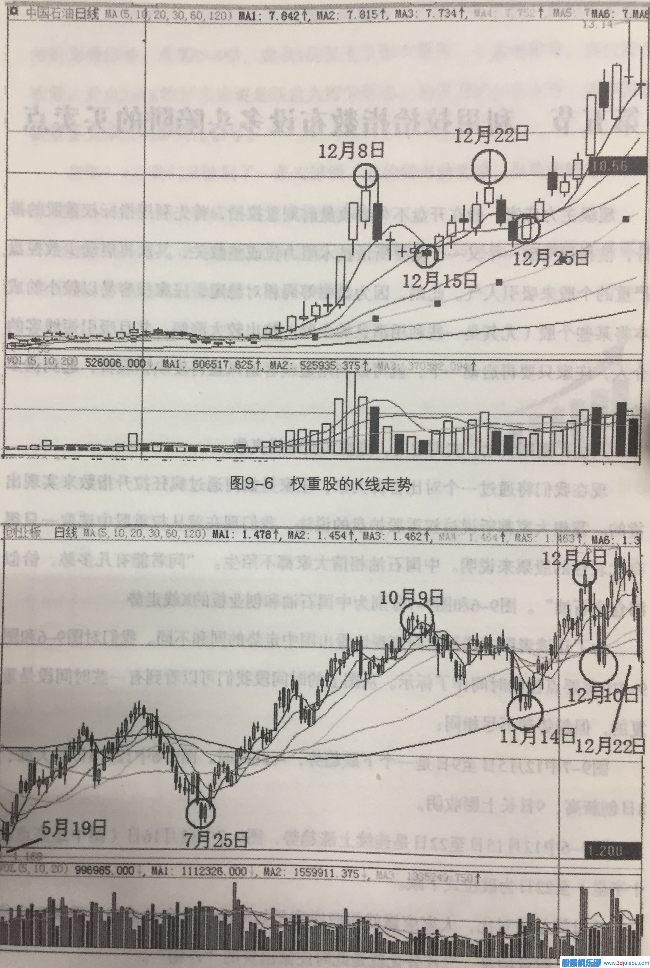 圖9- .7中12月5日至9日是一個(gè)下跌趨勢(shì)初學(xué)者如何看盤及K線圖分折利用拉抬指數(shù)布設(shè)多頭陷阱的買賣點(diǎn),與此同時(shí),圖9-6中12月5日號(hào)大漲、8日創(chuàng)新高、9日長(zhǎng),上影收陰。