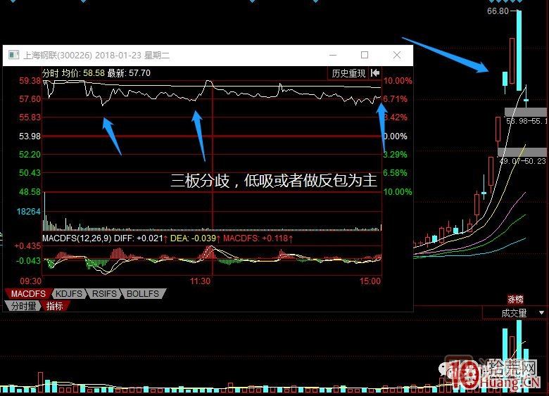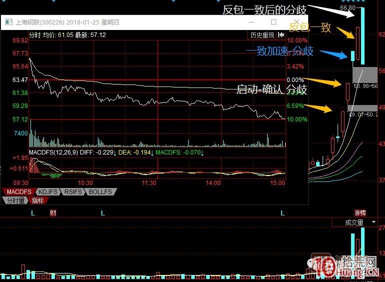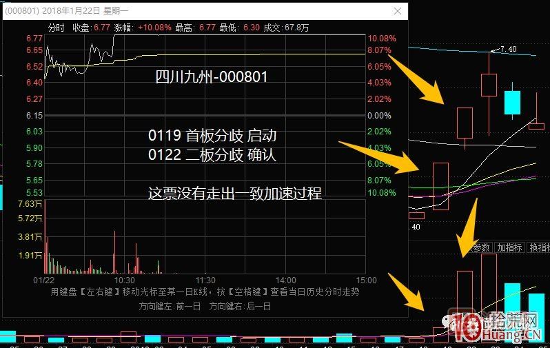 比如:創(chuàng)業(yè)板在01-22啟動(dòng)的時(shí)候,上海鋼聯(lián)已經(jīng)2連板了,從龍頭角度是放量2連板給予確認(rèn)的,這個(gè)時(shí)候帶起的板塊。01-23的時(shí)候,上海鋼聯(lián)被頂一字,這就是集合已經(jīng)加速階段了,然后炸板,這就陷入分歧了。日內(nèi)完成的一致(加速)-分歧,尾盤沒能回封。